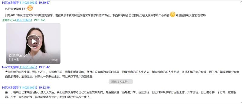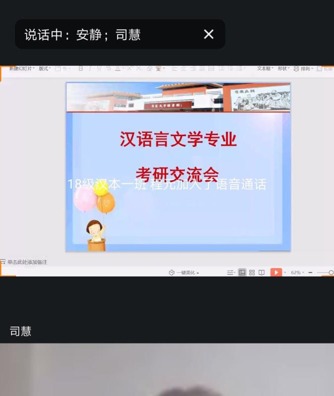 10月12日19:00-20:00,汉语言文学专业2020级新生考研交流会以线上方式进行,会议由司慧慧老师主持,邀请了刘慧萍、寇颖超、王萌哲及陈歌四位优秀员工分享了考研经验与心得,针对考研问题,与同学们进行线上沟通与交流。