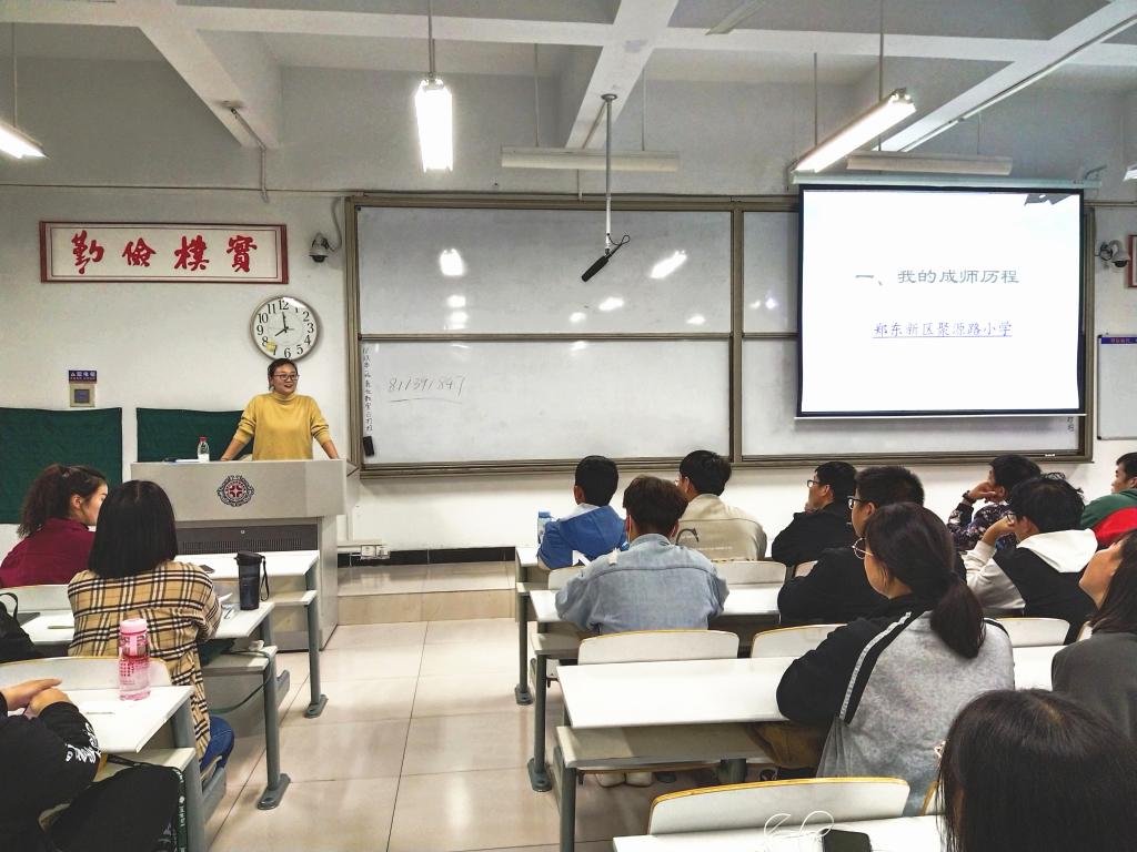 交流会上,于蓓蓓员工作了《成师历程——致我和你的青春》讲座,分享了自己成为一名优秀教师的历程、“我”的一天及小学老师日常工作,帮助同学们进一步了解了小学老师的工作内容与职责。