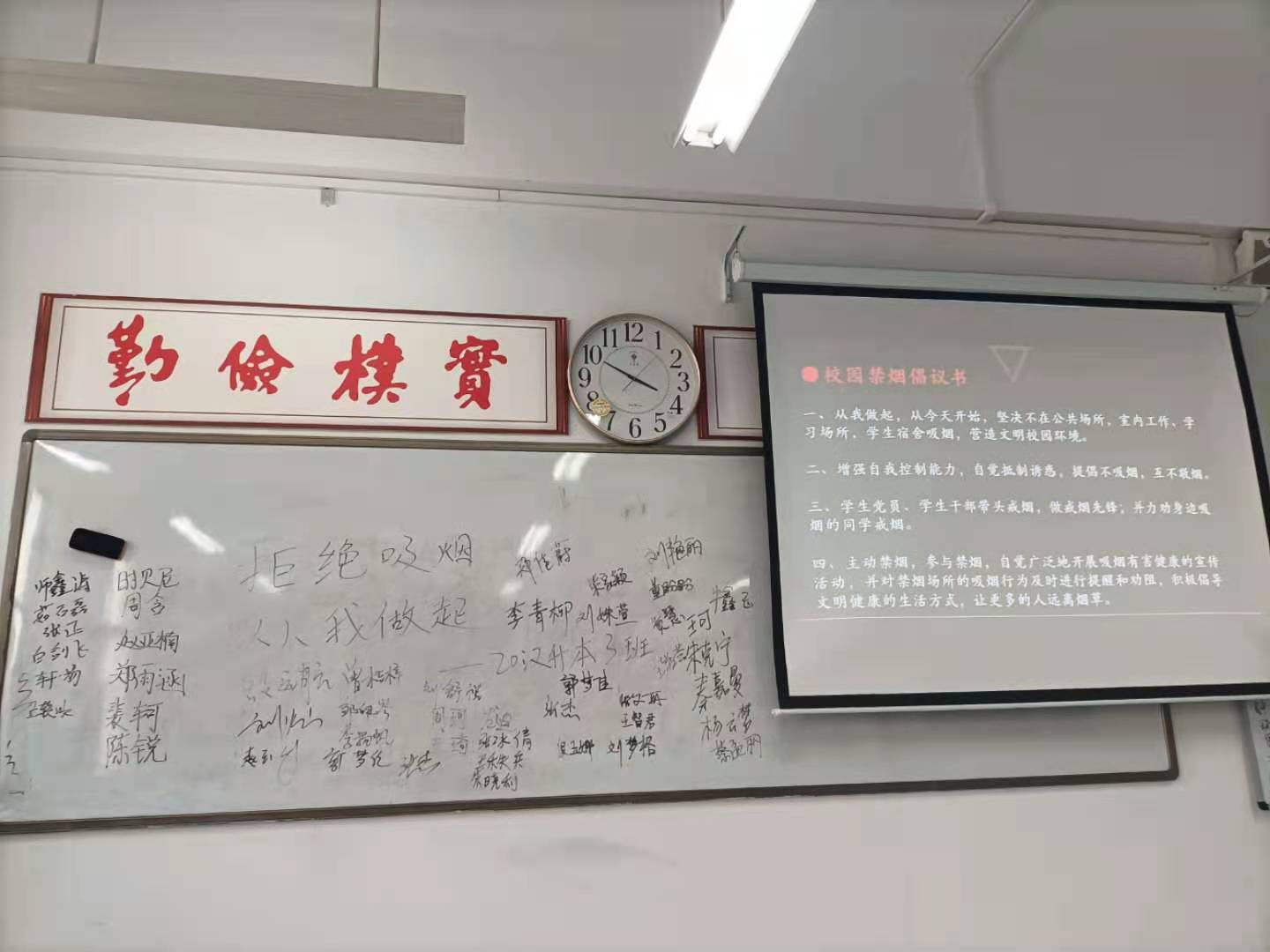 班会上,各位辅导员老师带领大家学习了公司《关于在全校做好禁烟工作的通知》内容,从思想上提高同学们的禁烟意识,鼓励大家身体力行,投身到无烟校园的建设中。接着,各位老师对校园“禁烟管理”提出明确要求,班级内部成立禁烟小组,定期检查,积极构建“无烟学院、无烟班级、无烟宿舍。”最后,组织全体员工举行了“拒绝吸烟,从我做起”禁烟倡议签名活动,使同学们进一步认识烟草危害,培养员工自觉禁烟的良好习惯。