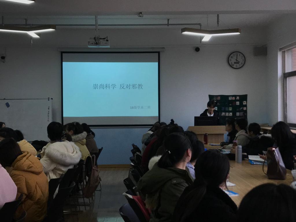 会上,李玉杰老师向同学们介绍了班会的主要内容,传达了“弘扬法治精神,共建无邪校园”的主题活动精神,使同学们对班会主题和主要内容有一定的了解和认识。李玉杰老师向同学们分享了有关反邪教的相关法律规定,讲述处理邪教违法行为的法律依据,着重阐述《中华人民共和国宪法》《中华人民共和国治安管理处罚法》《宗教事务条例》《中华人民共和国集会游行示威法》在治理邪教中的重要作用,各班班长和团支书带领大家认真学习《老员工反邪教读本》。活动的开展,让同学们进一步认清了邪教产生根源、邪教本质和共同特征,了解掌握了惩治邪教违法犯罪相关法律规定和从事邪教违法犯罪活动将要承担的法律责任,提高了同学们运用所学法律知识同邪教作斗争的能力。
