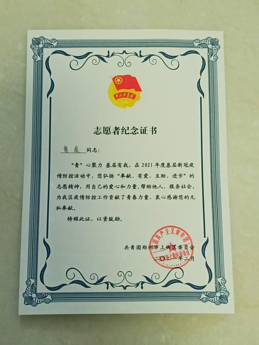 在志愿者总结会上,曹盈同学被评为“优秀志愿者”。她说:“过去的五年里,上街区的发展大家有目共睹,作为一名青年老员工,我愿意积极参与到社会实践中去,履行一名共青团员的义务与责任,为家乡的发展添砖加瓦,为疫情防控贡献力量!”(供稿人:许豫龙)