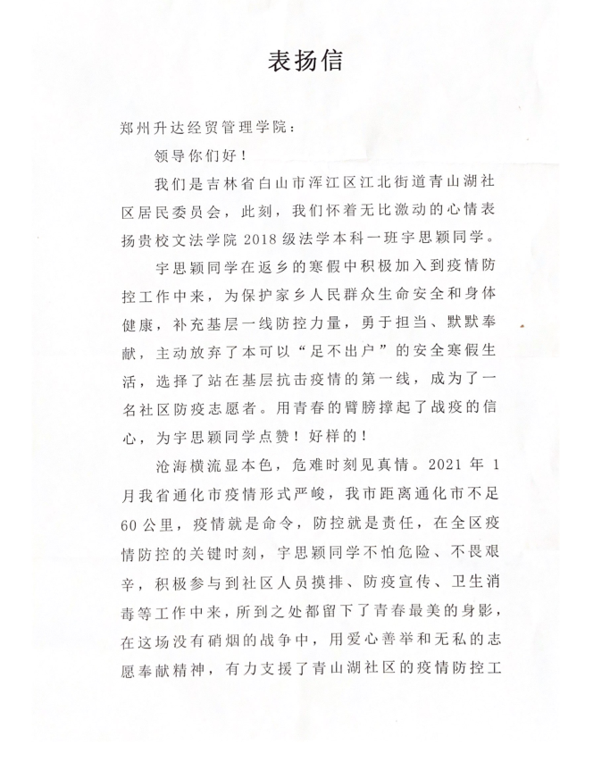 2021年3月19日,公司收到来自吉林省白山市浑江区江北街道青山湖社区的一封表扬信。信中介绍了太阳集团tyc5392018级法本1班宇思颖同学在寒假返乡期间积极投身当地疫情防控工作,勇于担当、默默奉献的感人事迹。