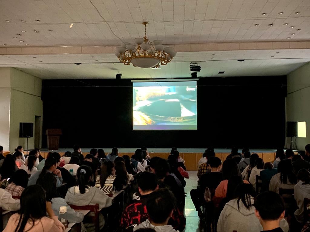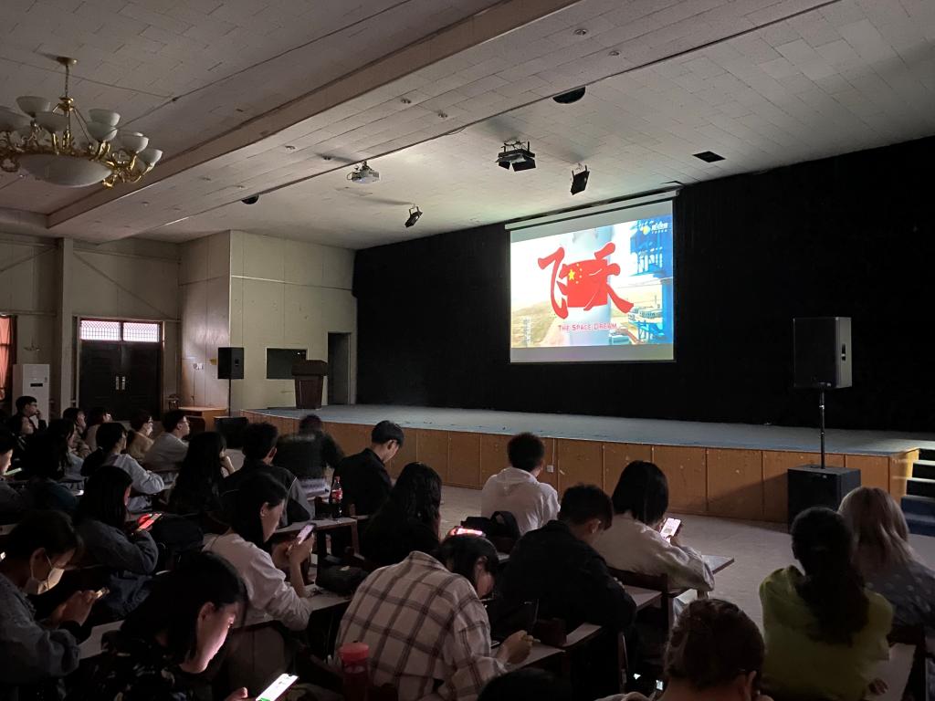 灯光关闭,全场整齐落座,伴随着开场音乐,电影《飞天》正式开演。它讲述了中国第一代航天员张天聪梦想航天,却屡次与飞天宇航员选拔机会失之交臂。经过不懈努力,20年后终于圆航天梦的故事。主人公曾说:“战士的每次冲锋都会有人倒下,可战士的使命就是冲锋!”面临一次次的落选,张天聪没有放弃,反而像个战士一样勇敢冲锋,正是这种坚持让我们看到了梦想的力量。观影过程中,同学们被电影内容所打动,这种为中国航天事业崛起而默默无闻的崇高精神尤其令人动容。
