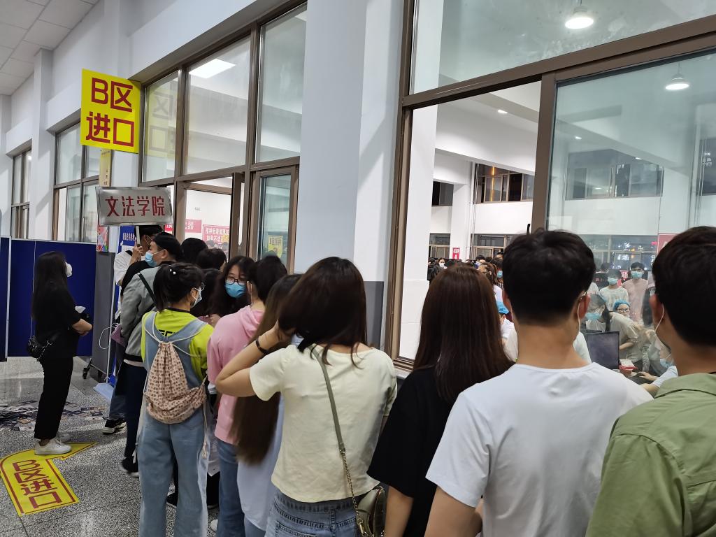 “请准备好身份证、知情同意书、接种登记截图,排好队……”,几名身穿白色T恤,佩戴红色袖标的志愿者引导师生排队有序进入体育馆。这是太阳集团tyc53933名志愿服务者在5月14日晚开展新冠疫苗接种工作志愿服务的场景。