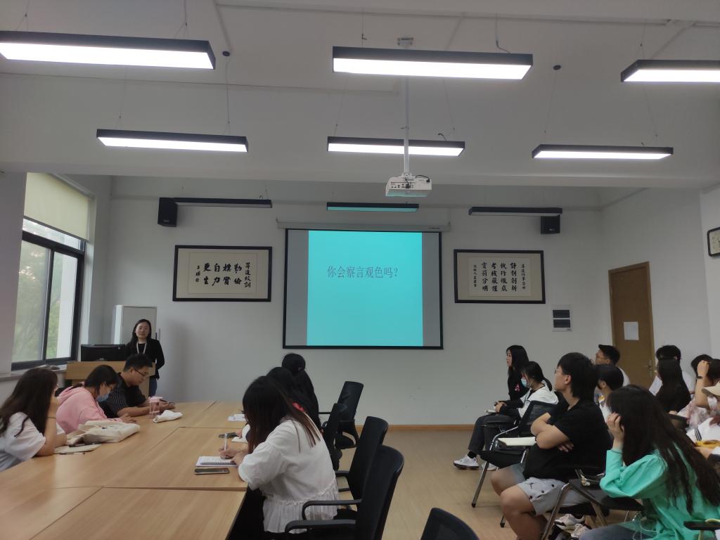 首先李玉杰老师介绍了张甜梦老师的个人简介,接下来张甜梦老师以“情绪情感的表达”为主题展开培训。张老师以“你会察言观色吗?”问题导入,利用杜甫的古诗抒发的忧郁之情引出正题。接着,张老师对“微表情”作出解释,可以通过表情、姿态、姿势、声音、语调揣摩心理。接着张老师借助几组图片进行实验,有效地测验了大家对“微表情”的观察能力。截取了《捉妖记》的片段,张老师通过两个例子引出“共情”的概念,并指出“共情”的四个重要特征,这不仅调动了心理委员的学习积极性,且有助于心理委员对概念的深入理解。最后,张老师强调心理委员们要学会尊重、倾听别人,学会换位思考和接纳以此来做到真正理解他人。培训最后,张老师对心理委员寄予希望,号召大家以微笑感染他人,以共情联结他人。培训会结束后,心理专员李玉杰老师对5.25心理活动月接下来的工作做了部署和安排。