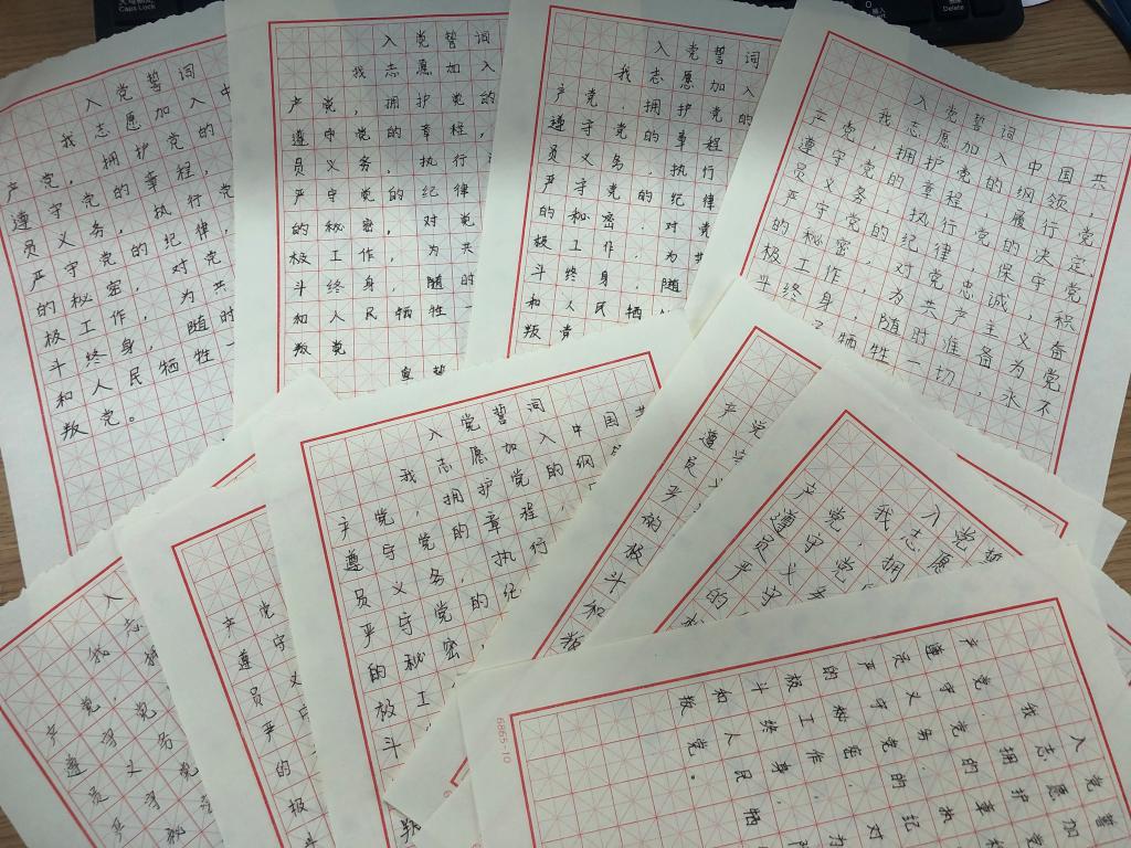 “我志愿加入中国共产党,拥护党的纲领,遵守党的章程……”在党员们认真郑重的书写下,入党誓词在笔尖流淌,在纸上跳动,既庄重又热烈,鲜活于党员炽热的胸膛之上。短短80个字和12个标点符号,党员们用了十多分钟才抄写完毕,在审核的同时再次领悟入党誓词中的一字一句,入心、入脑,牢固为共产主义事业而奋斗的理想信念。