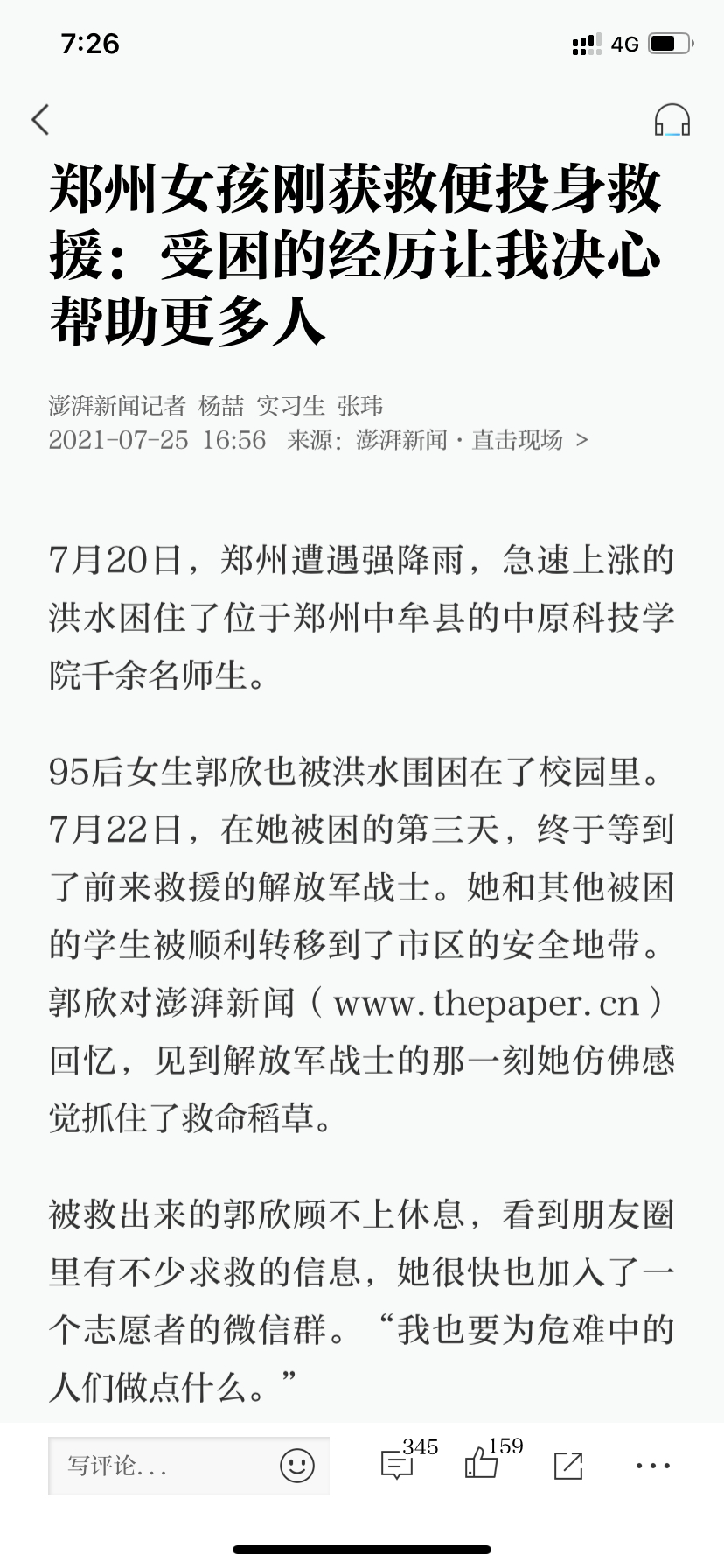23日晚抵达新乡已近十点,郭欣一行与蓝天救援队顺利对接后立刻投入到救援工作中。新乡当地受灾严重,多个村庄被洪水包围,郭欣作为队伍中为数不多的女同志,被安排到蓝天指挥部任务组,负责调配救援人员、核实求救信息、统计救援情况、运送分配救援物资等,每天忙碌至凌晨三四点才休息,第二天六点又起床继续投入工作。郭欣不怕苦累、勇敢担当的精神感动了当地的群众和在现场的新闻记者,随后澎湃新闻、浙江日报、今日头条报道了她的事迹,获得了广大网友的高度赞扬。