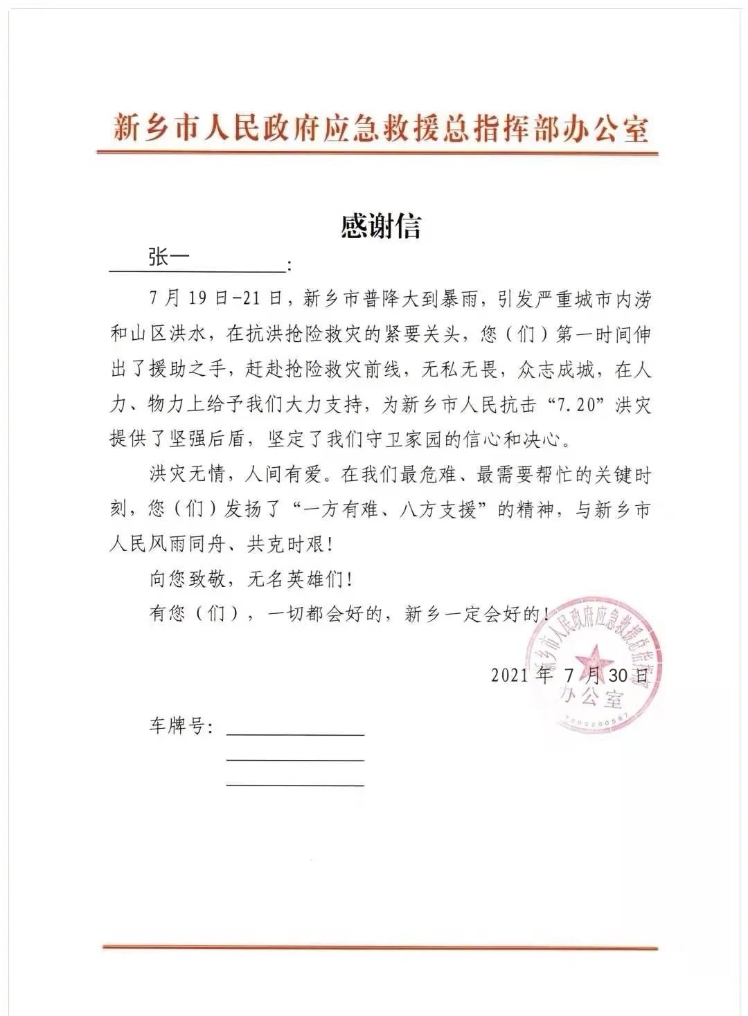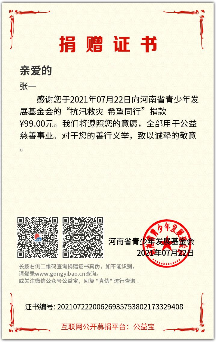 7月21日新乡洪灾发生当天,张一就用自己的零花钱为家乡捐款,并冒着暴雨前去抗洪一线搬运沙袋。7月23日新乡黄河口水位大幅上涨与河岸齐平,随时有倒灌城区的可能,情况危急,救援工作太多急需志愿者,张一看到消息后立刻赶往现场参加防汛救灾。任务结束后又立即投入到上河城小区的救灾任务中直到凌晨一点多才回到家。此后数天内张一陆续参加了位于新乡市传染病医院、新乡市卫生监督局等至少五次救灾志愿服务,他还加入微信线上志愿者群,与其他志愿者一起用网络织起“汛情信息网络”,将多种渠道信息整理、审核、汇总,提供给前线救援队和志愿者,帮助他们及时接收救援信息、合理调配物资,实现救援效率最大化。