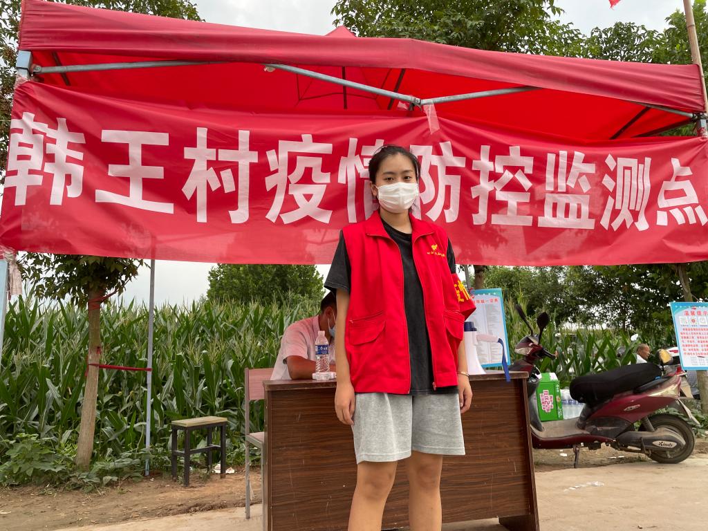 曹洋洋同学家住驻马店市上蔡县杨屯乡韩王村,8月9日起她主动到村委的疫情防控卡点进行志愿服务。每天她早早来到卡点,为过往车辆消毒,提醒居民佩戴口罩,检查行人健康码,查看外来人员的行程码、健康码和核酸检测报告等。全员核酸检测期间,她协助村干部组织居民有秩序地完成全村核酸检测工作。志愿服务时间长、强度大,加上天气炎热,工作非常辛苦,但曹洋洋始终坚守在岗位上。