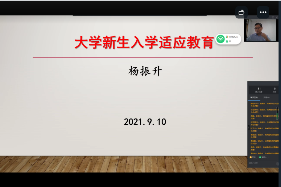 接着,杨振升老师就入学适应教育为大家做了讲话。他说,从高中到大学,学习和生活环境变了,我们要学会适应新环境,学会独立生活、学习、思考。他提到,大学阶段,良好人际关系的建立很重要,要学会平等交往、尊重他人、真诚待人、互助互利。另外,杨振升重点谈到大学学习适应,他为大家分析了大学学习的特点、学习方法、学习动力等,希望大家尽快适应新环境,成长成才。
