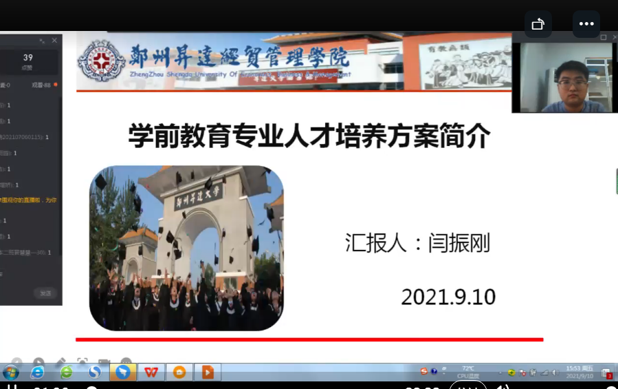 9月10日下午,学前教育教研室组织组织教师为2021级学前教育本科新生通过线上方式开展入学教育。会议由杨英琪老师主持,闫振刚主任及几位专业骨干教师参加。