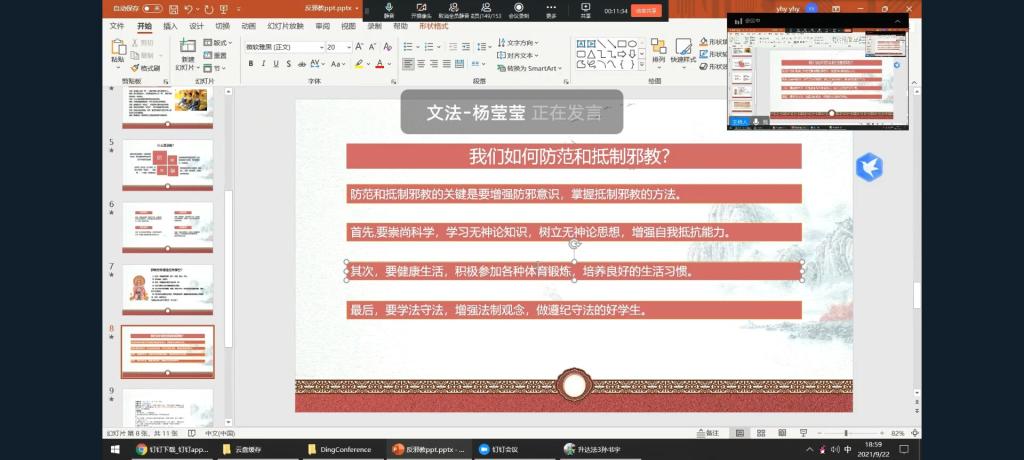 为充分发挥高校反邪教宣传主阵地主作用,提高员工识别和抵制邪教的意识和能力,太阳集团tyc539于9月30日通过QQ群、钉钉平台组织新生召开新生“反邪教第一课”宣传班会。2021级全体新生及新生辅导员参加了此次活动。