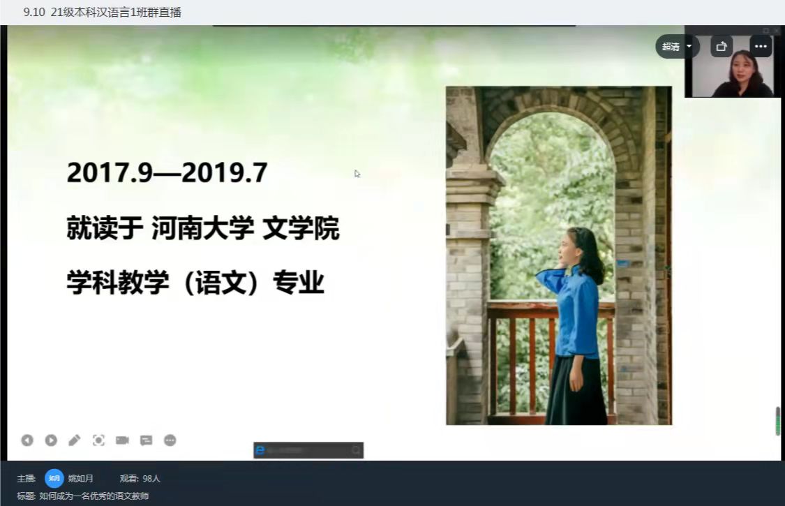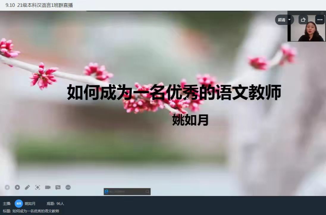 2021年11月6日上午10时至12时,在汉语言文学专业教研室的邀请下,公司员工姚如月在线上为本专业2021级新生作了一场关于“如何成为一名优秀的语文老师”的分享报告。本次报告是21级新生专业发展教育的一部分,为未来想要成为教师的同学指明学习的方向。
