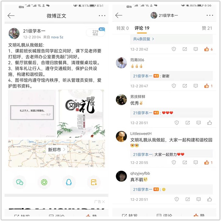 在21级学前教育本科1班团支部的发起下,各班在班级微博开展“我是文明宣传员”网络宣传活动。活动期间,各支部从“课堂礼仪”、“餐厅礼仪”、“行车规范”、“图书馆礼仪”等角度出发,分享名人名言、文明故事以激发同学们的文明意识,并动员同学们积极阅读、转发、评论留下对文明礼仪的相关看法和认识,评论中同学们纷纷表示要努力构建文明礼貌校园,将文明礼仪践行到学习生活之中,在日常生活中从我做起,规范言行,课前班长喊起立问好,课下主动向老师问礼;餐厅就餐后归放餐具,清理餐桌垃圾;图书馆内遵守馆内秩序,服从管理员安排,爱护图书资料,将文明校园、礼貌礼仪融入到校园生活中。