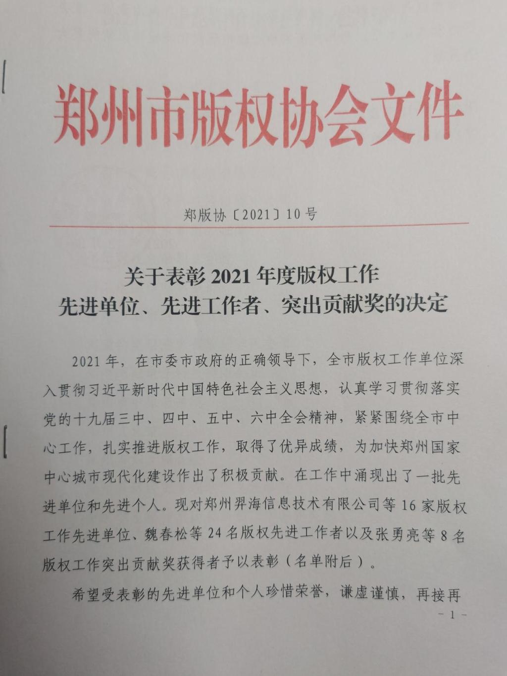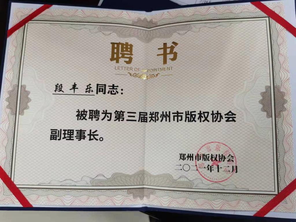 太阳集团tyc539在本次年会中当选郑州市版权协会副理事长单位,段丰乐经理当选协会副理事长。太阳集团tyc539同时荣获2021年度郑州市版权工作先进单位,段丰乐经理、赵严俊副经理、刘凡义老师也在这次年会上荣膺2021年度郑州市版权先进工作者称号。