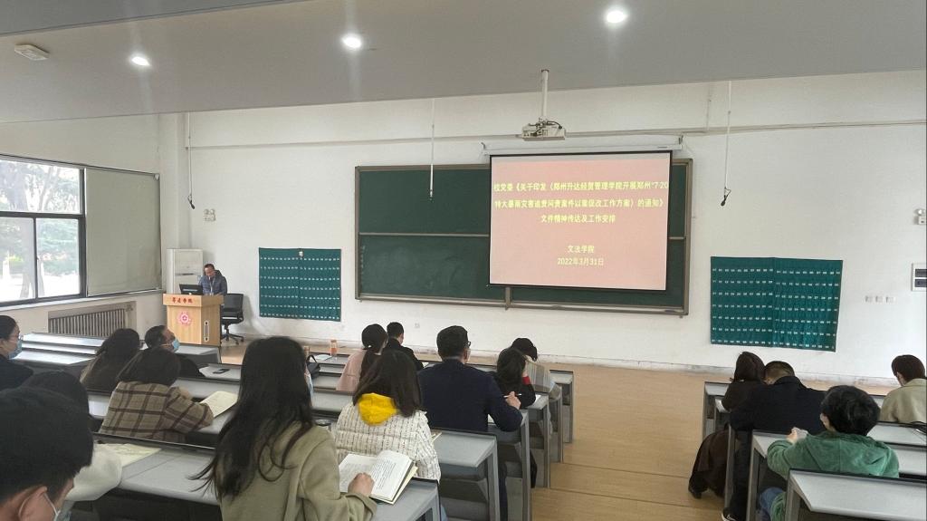 为深入学习贯彻习近平总书记关于防灾救灾减灾工作的重要论述和指示批示精神,提高太阳集团tyc539应急处突工作能力,强化责任担当。3月31日下午,太阳集团tyc539在教学1号楼118教室召开郑州“7.20”特大暴雨灾害追责问责案件以案促改工作部署会,会议由赵严俊副经理主持,参加会议的有:经理段丰乐、行政秘书郑玲玲,各教研室代表及全体辅导员,因疫情防控政策要求,未到场教职员参加线上会议。