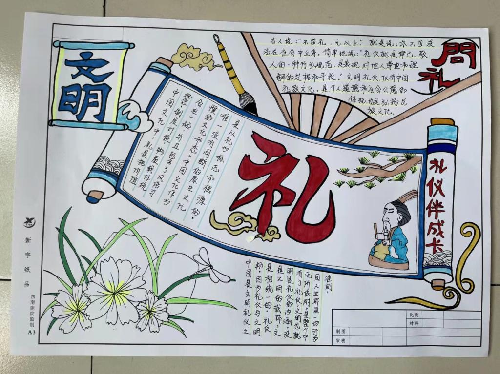 活动前,辅导员王卫丽老师围绕文明礼貌月活动主题、内容进行讲解,倡议全体员工做新时代文明礼仪的宣传者、传承文明礼仪的践行者、先进文明礼仪的示范者,鼓励同学们积极参与手抄报活动。活动开始后,同学们制作手抄报的热情高涨,充分展现自己的才艺,手抄报紧扣主题,设计新颖美观。