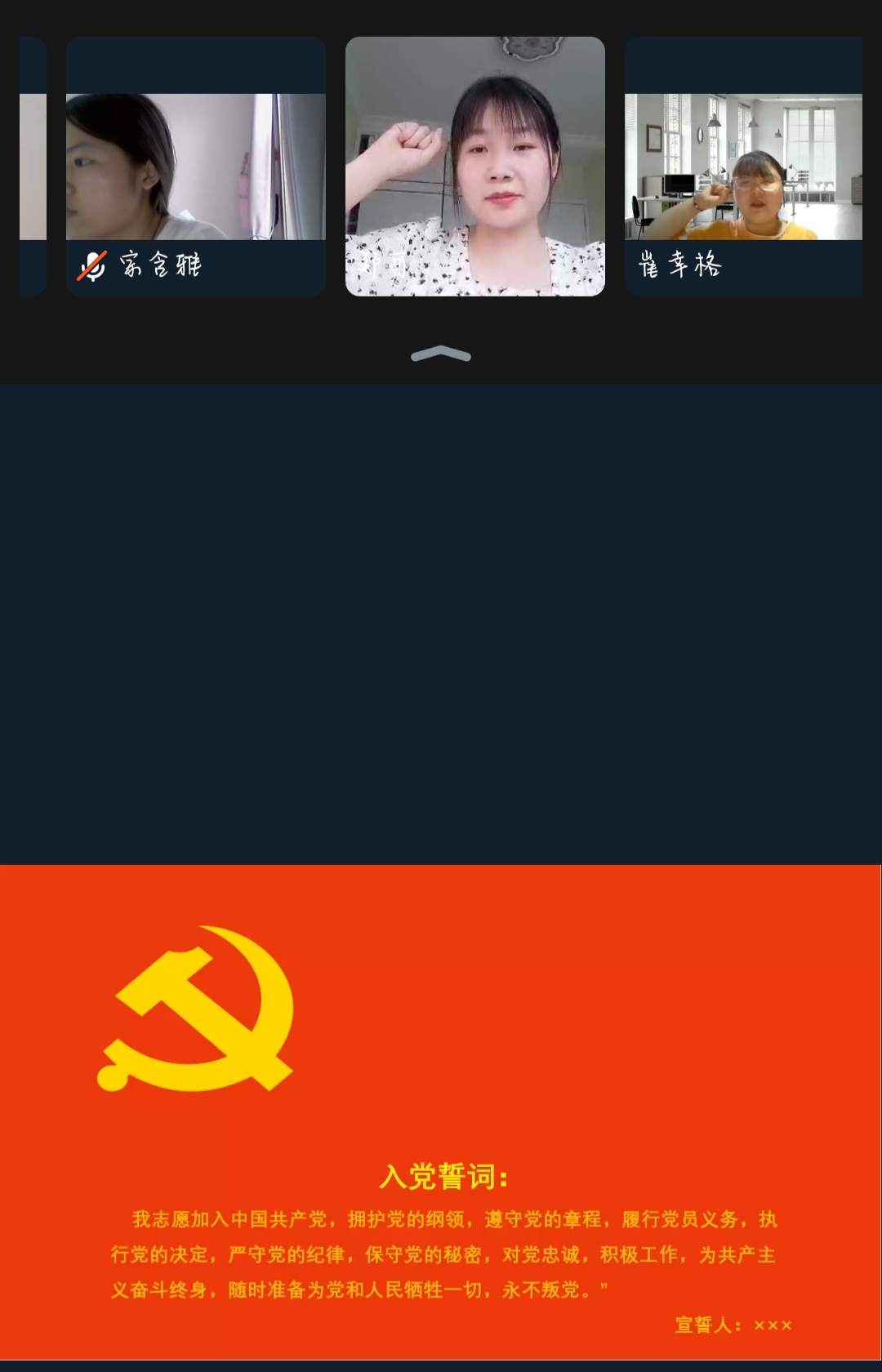 组织委员孟醒老师首先传达上级党组织对预备党员转正的程序要求,并宣读预备党员转正名单。王宁宁等12名预备党员依次从思想、工作、学习、生活等方面向党组织进行总结汇报,培养联系人张喜超老师、舒展老师对一年预备期内预备党员的基本情况进行总结评价。支部正式党员一致同意王宁宁等12位同学如期转正,支部全体师生党员在优秀毕业生党员赵伟崴同学的带领下面向党旗庄严宣誓。