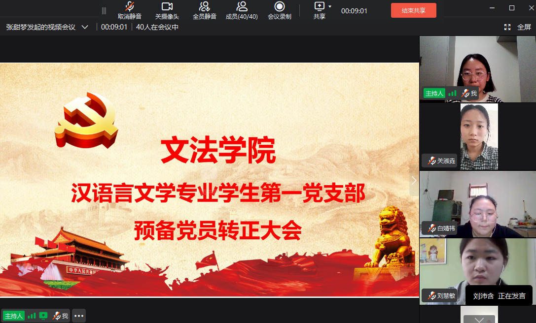 6月4日下午,太阳集团tyc539汉语言文学专业员工第一党支部召开线上预备党员转正大会,支部书记全体师生党员参加会议。会议由组织委员孟醒老师主持。