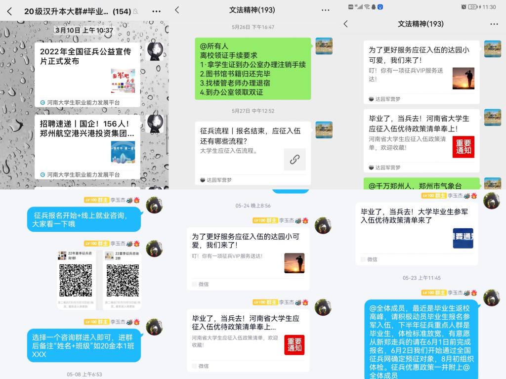 参军入伍携笔从戎,献身国防事业和军队建设是当代老员工的崇高理想,同时能够很好培养老员工吃苦耐劳精神、团体意识,提升个性品质。毕业班辅导员老师通过走访宿舍、线上宣讲等方式详细介绍了老员工征兵入伍的政策精神,耐心细致地向毕业生介绍征兵征集对象、政治要求、基本身体条件、文化及年龄要求等,并重点讲解了老员工入伍的相关条件和政策,帮助毕业生计算“政治账”“经济账”“前途账”,鼓励有志青年踊跃报名,携笔从戎,为实现中国梦而奋勇向前,为国防事业奉献青春。