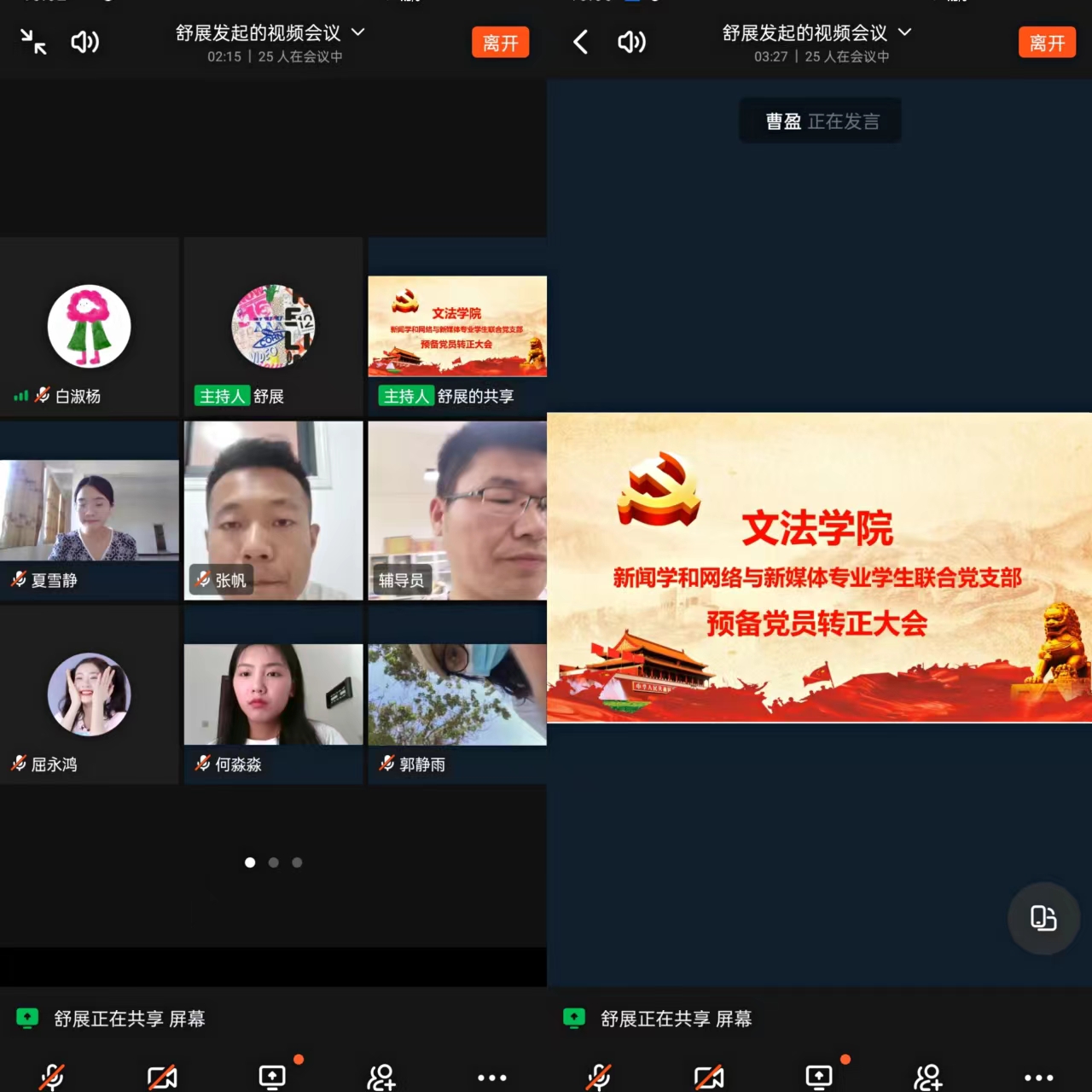 2022年6月6日下午,太阳集团tyc539新闻学和网络与新媒体专业员工联合党支部以视频会议的形式召开预备党员转正大会,支部全体师生党员参会,会议由支部组织委员舒展老师主持。