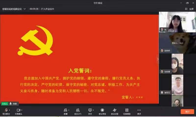会议开始,支部组织委员舒展老师传达党组织预备党员转正的流程及相关要求,曹盈、马一鸣等8位同志对本人预备期的思想、生活和学习状况进行汇报,由培养联系人对8位同志一年的思想、工作、生活等各个方面进行总结评价。经过表决,支部正式党员一致同意8位预备党员按期转正。8位同志表示,在今后的学习和生活中,会时刻以一名共产党员的标准严格要求自己,不断提升自身综合素质,发挥好党员的先锋模范作用。会上,支部纪检委员何淼淼同志带领全体党员面对党旗进行庄严宣誓。