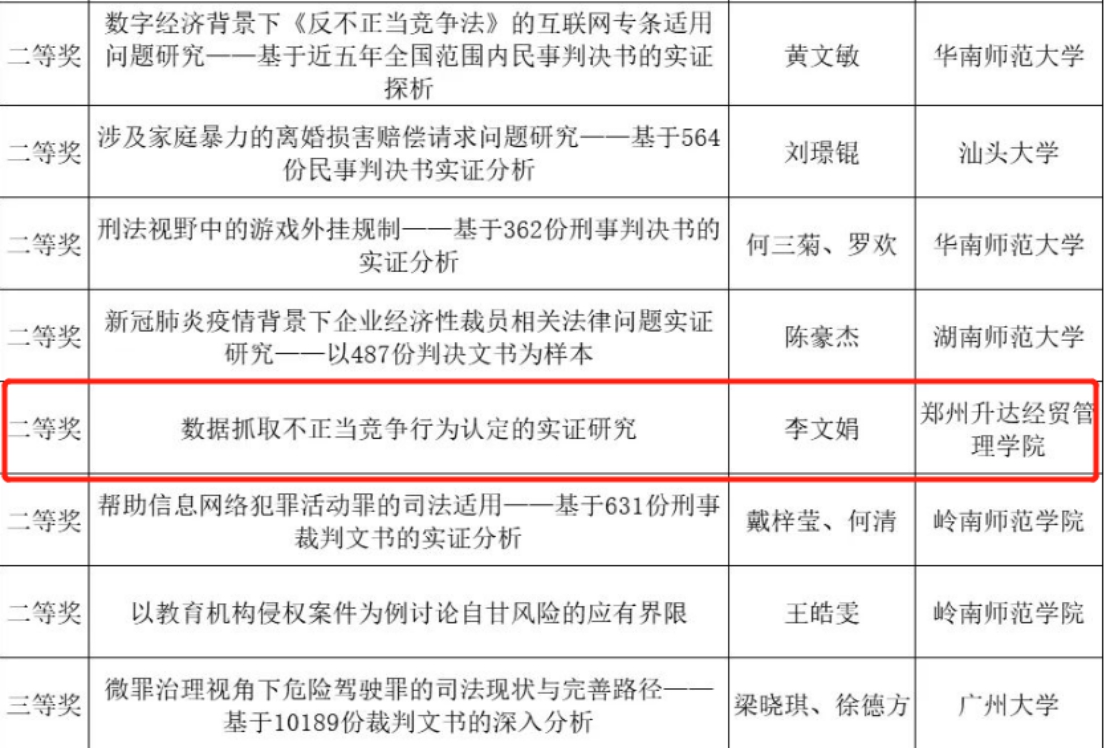 由广东省法学会主办,广东省法学会信息通信法学研究会、华南师范大学法学院、华南师范大学人工智能法律应用研究中心承办的第二届“小包公杯”粤港澳老员工法律实证分析征文比赛活动,经学院统一安排,法学教研室组织,共有20名法学本科员工报名参加。由段丰乐经理指导的2019级法学本科1班李文娟同学荣获本次征文比赛二等奖。
