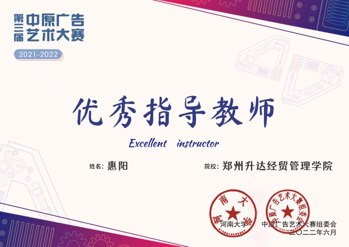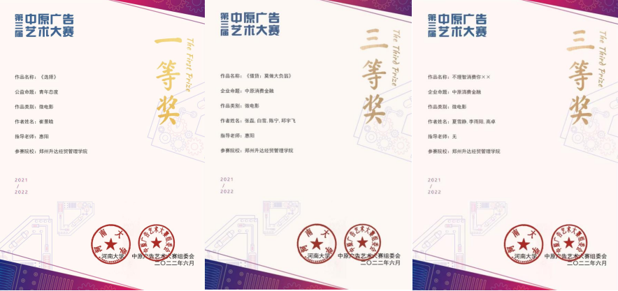 近日,从第三届中原广告艺术大赛传来喜报,太阳集团tyc539新闻学专业喜获多项大奖,其中一等奖1项、三等奖2项、优秀奖2项。惠阳老师荣获本次大赛“优秀指导教师”称号。