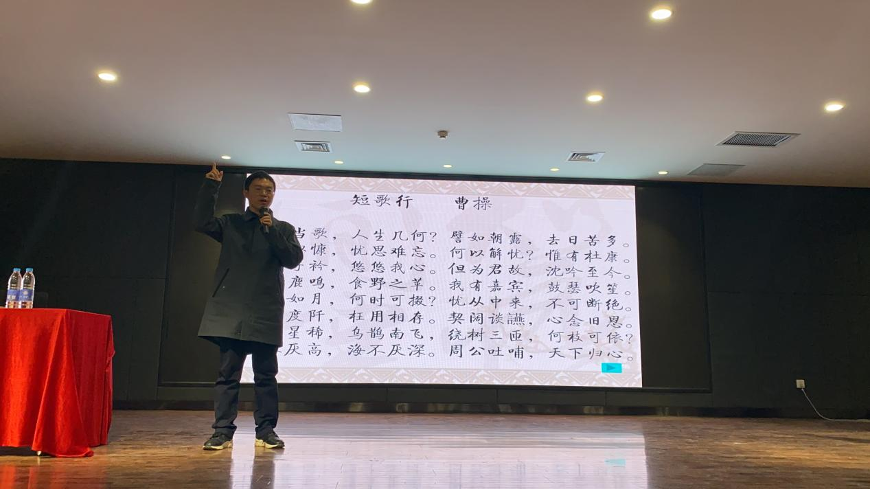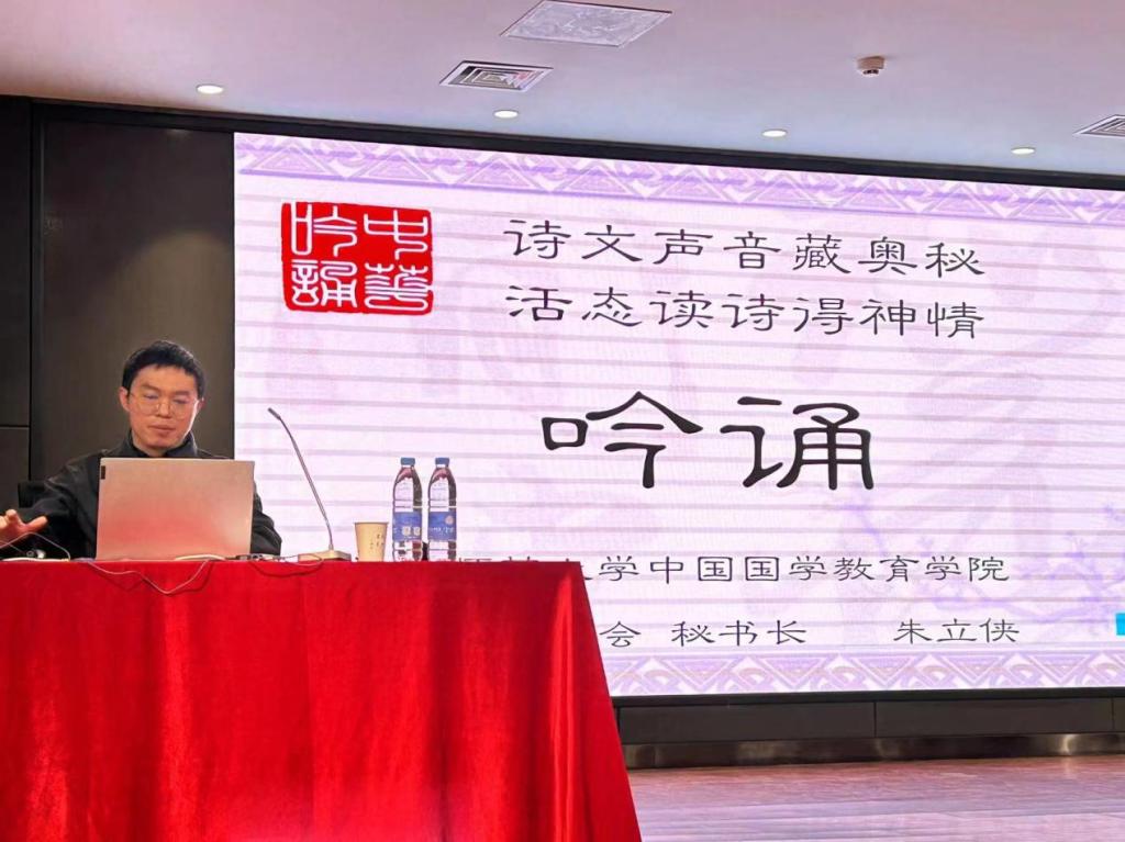 在讲座中,朱立侠博士讲述了吟诵的意义和基本规则,亲自示范了各种文体的吟诵方法,带领师生现场练习吟诵。他介绍:“读书自古皆吟诵”,吟诵是中国三千年来读书的传统。它发端于先秦,在官学和私塾中,口传心授,代代相传,流传至今,成为文人的基本技能;“诗词文赋各有吟”, 吟诵是汉诗文的传统读法,不同文体有不同声音形式,诗词歌赋,各有其声情,吟诵时要注意文体的区别。讲座中,朱老师随便一首古诗词即可脱口而出、即兴吟诵。不仅如此,他还饶有兴致地带着大家吟诵《清明》《登鹳雀楼》《关雎》《将进酒》《短歌行》《岳阳楼记》等古诗文,情真意切、优美动人的吟诵将师生带入吟诵的世界,切身体会到了古诗文的声音原貌。朱博士还深入浅出介绍了汉语读法对于解读诗词的意义,为诗词解读找到了新的路径。
