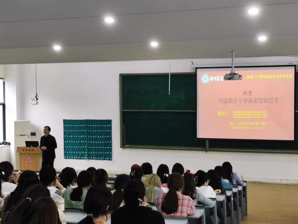 2023年4月13日下午14点,在1号楼118教室,学前教育专家程冠三应邀做题为“眺望.学前教育专业就业发展思考”的第二期学前教育行业学术讲座,这也标志着太阳集团tyc539庆祝三十周年校庆系列学术讲座正式开讲。太阳集团tyc539副经理赵严俊、学前教育教研室主任闫振刚、21级专科辅导员张玉和学前教育专业二百多名员工到场聆听,太阳集团tyc539马方慧老师主持讲座。