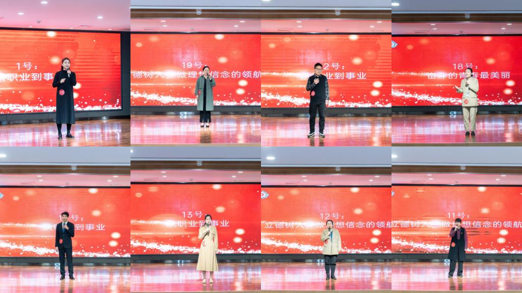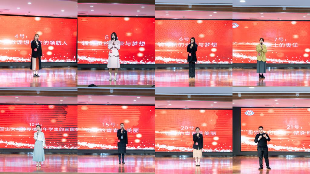 本次大赛分为初赛、复赛和决赛三个环节。首先,由各学院通过院赛推选参加学校初赛选手,初赛为员工工作基础知识测试,于4月17日上午在教学一号楼118举行。基础知识测试重点考察辅导员的理论素养和业务知识,内容涵盖了习近平新时代中国特色社会主义思想、党的二十大精神、全国教育大会精神、高校思想政治工作会议精神、《普通高等学校辅导员队伍建设规定》、《高校思想政治工作质量提升工程实施纲要》、《高等学校辅导员职业能力标准(暂行)》、思想政治教育专业知识和相关法律法规等。复赛为案例分析,于4月19日上午分别在教学2号楼107和116两个赛场举行,参赛辅导员两两组队,先后完成个人阐述和案例研讨两个环节,案例题目涵盖学业发展问题、评奖评优机制、心理问题疏导、网络思政教育等各个方面,综合考察辅导员分析问题、研判问题、思考问题、解决问题的综合应用能力。经过初赛和复赛,22名辅导员进入最终的决赛。决赛为理论宣讲环节,以现场展示方式进行,旨在考察辅导员对马克思主义理论、习近平新时代中国特色社会主义思想、党的二十大精神等的学习宣传阐释能力。比赛现场,选手们旁征博引、妙语连珠、情感真挚,就“肩上的责任”“从职业到事业”“辅导员的光荣与梦想”“奋斗的青春最美丽”等主题进行了精彩宣讲,比赛现场气氛热烈。