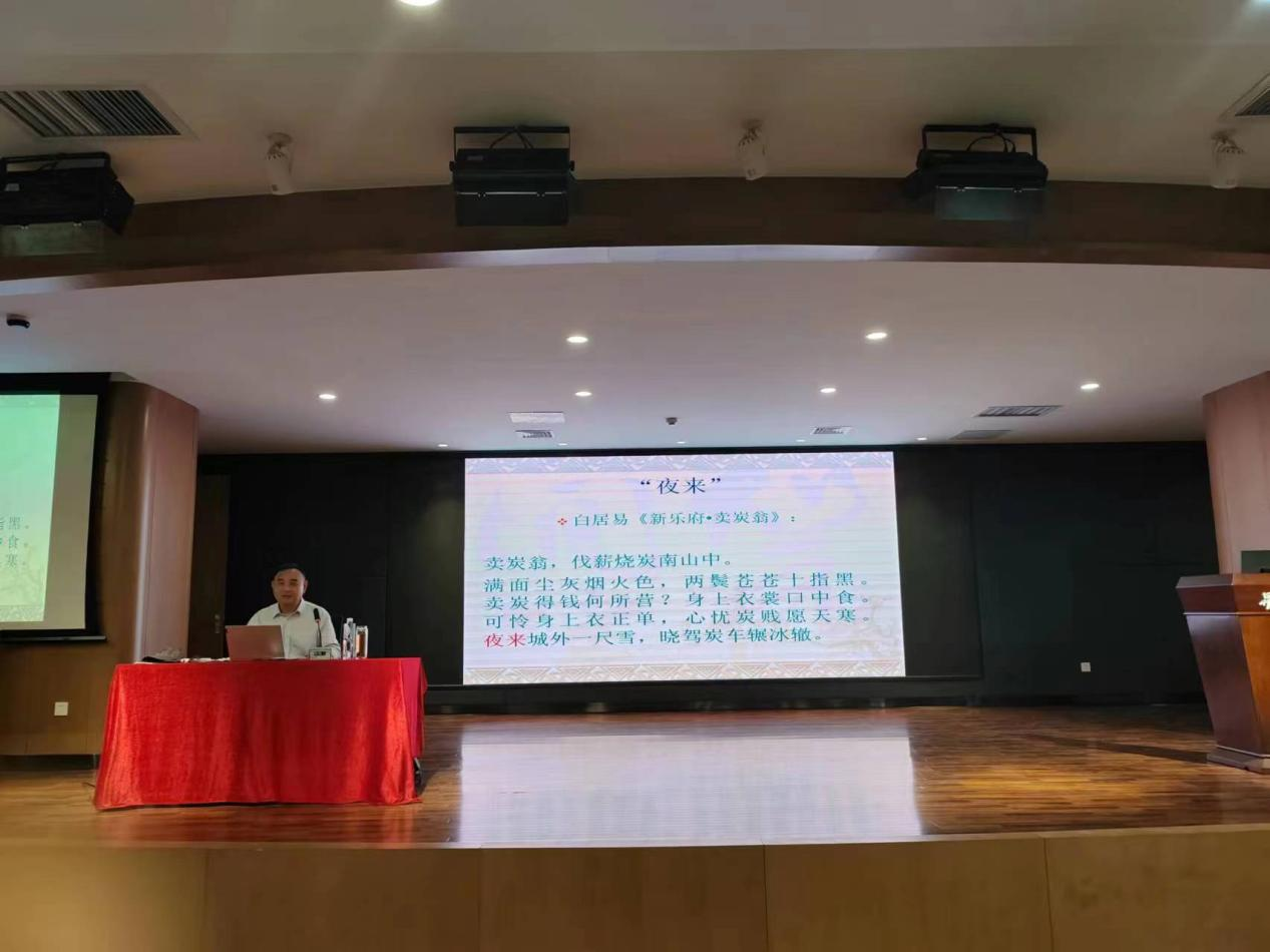 郭杰教授的报告从“如何赏读古典诗歌”谈起,指出欣赏古典诗词,要了解其发展史、领悟其意境、熟悉经典名篇、掌握词语意义。郭教授选取了白居易诗歌中的若干词语进行训释示范,如“夜来”“晚来”“早晚”“老大”“轻肥”“踏歌”“孤灯挑尽”“梦啼妆泪”等。郭教授强调只有深入了解作品的词语意义,以及相关文化历史背景,才能领会其中的真趣,产生强烈的共鸣;这是中文专业员工应有的专业素质,也是宝贵的专业优势。郭教授的讲座深入浅出,生动有趣,有不少观点十分新颖,让人茅塞顿开。郭教授在讲座结束之前分享了他于前一日即兴创作的《题赠白居易故里并白居易文化园》一诗:“往事千年越,今来此院前。白墙环绿树,青瓦映蓝天。李杜三家立,诗文百世传。族人多儒雅,薪火照尘寰。”诗歌文采斐然,情景交融,并充分肯定了白居易与李杜在唐代诗坛中三足鼎立的地位。