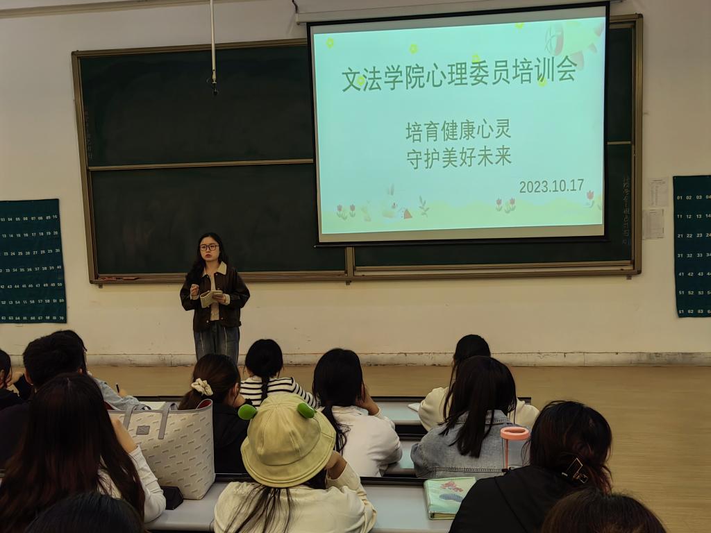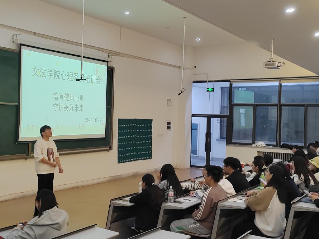 培训首先由2022级心理委员代表田欣雨向全体心理委员详细介绍了近期学院筹备开展的心理活动内容及具体要求,其次由2022级心理委员代表杨晗向全体成员介绍了班级心理委员开展工作的方法与技巧。
