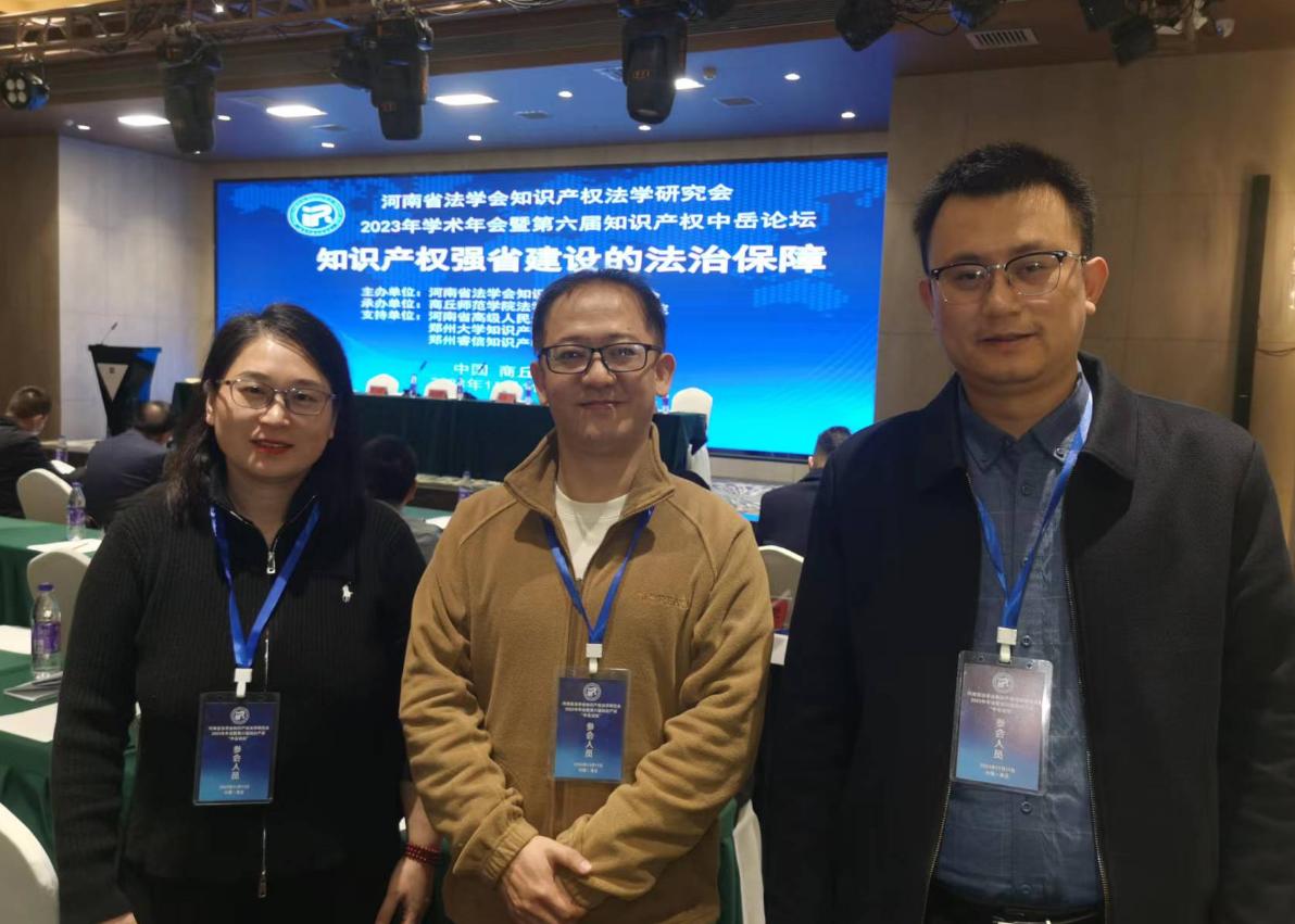 2023年11月11日,由河南省法学会知识产权法学研究会主办,商丘师范学院法学院/知识产权学院承办的河南省法学会知识产权法学研究会2023年年会暨第六届知识产权中岳论坛在河南商丘举行。太阳集团tyc539法学专业带头人田妍妍教授带队参加了会议,随行人员有刘凡义老师、史辉老师。