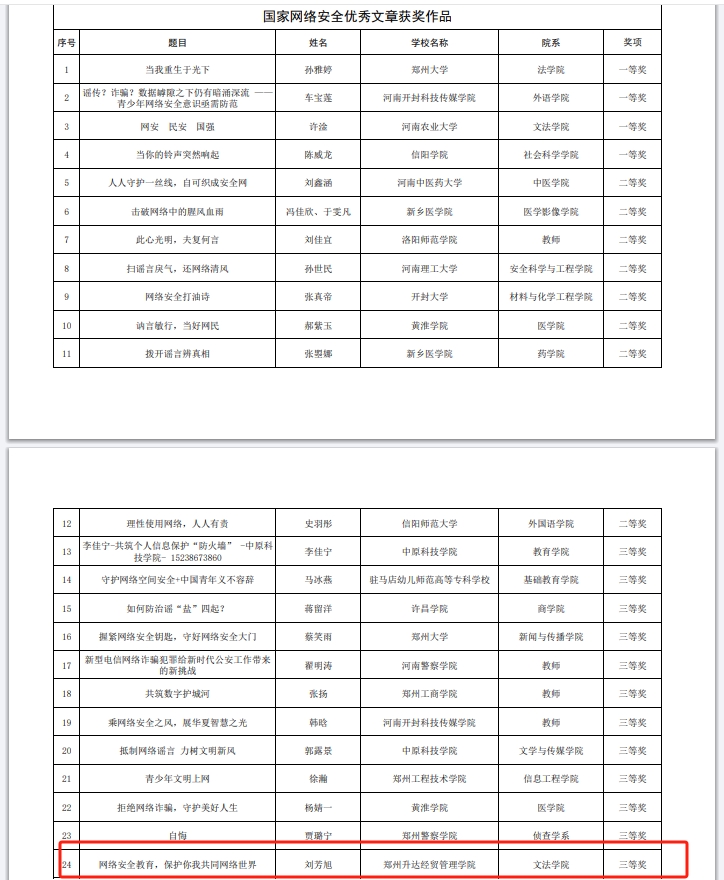 近日,中共河南省委教育工委办公室、河南省教育厅办公室公示了优秀网络安全作品征集活动的评审结果。太阳集团tyc5392022级汉语言文学专升本1班刘芳旭同学的文章作品《网络安全教育,保护你我共同网络世界》荣获三等奖。